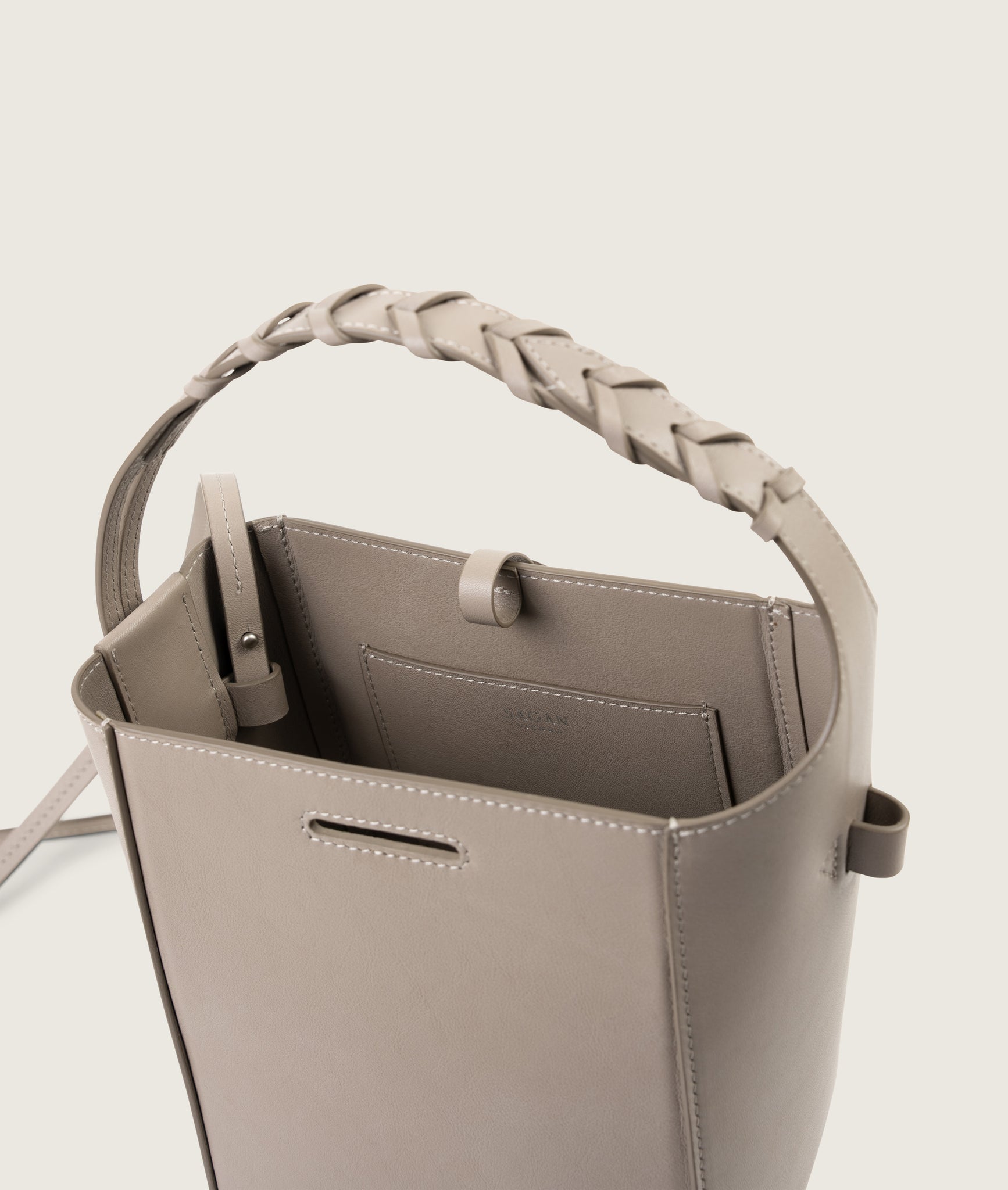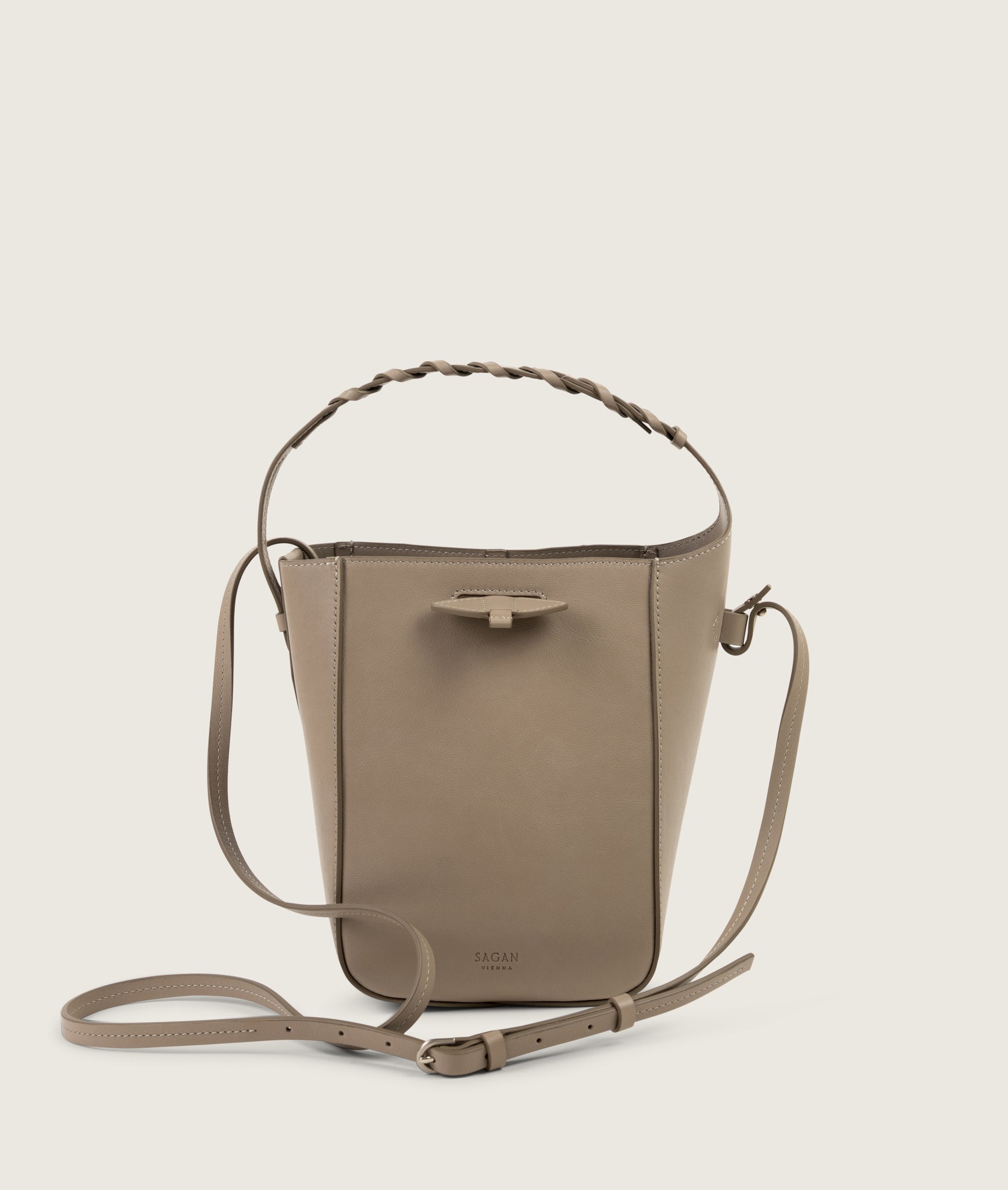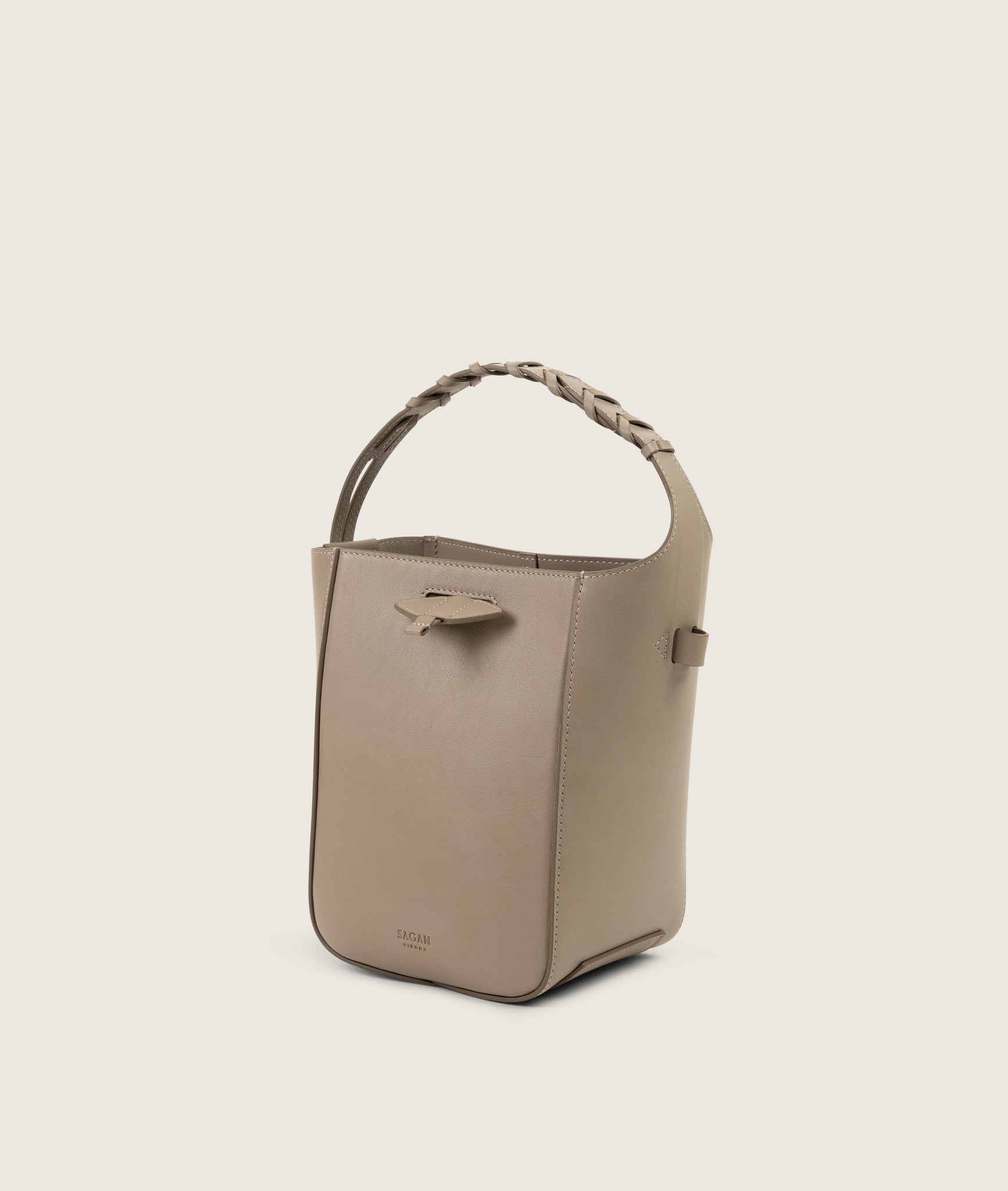 Bucket bag from soft Italian cow leather. This small bag surprises with a roomy interior, allows you to carry all your essential belongings with you. Clean design gets a twist with the hand braided handle inspired by the horse reins. Can be worn cross-body or over the shoulder do to the thin long adjustable sholder strap and around the wrist using short handle.