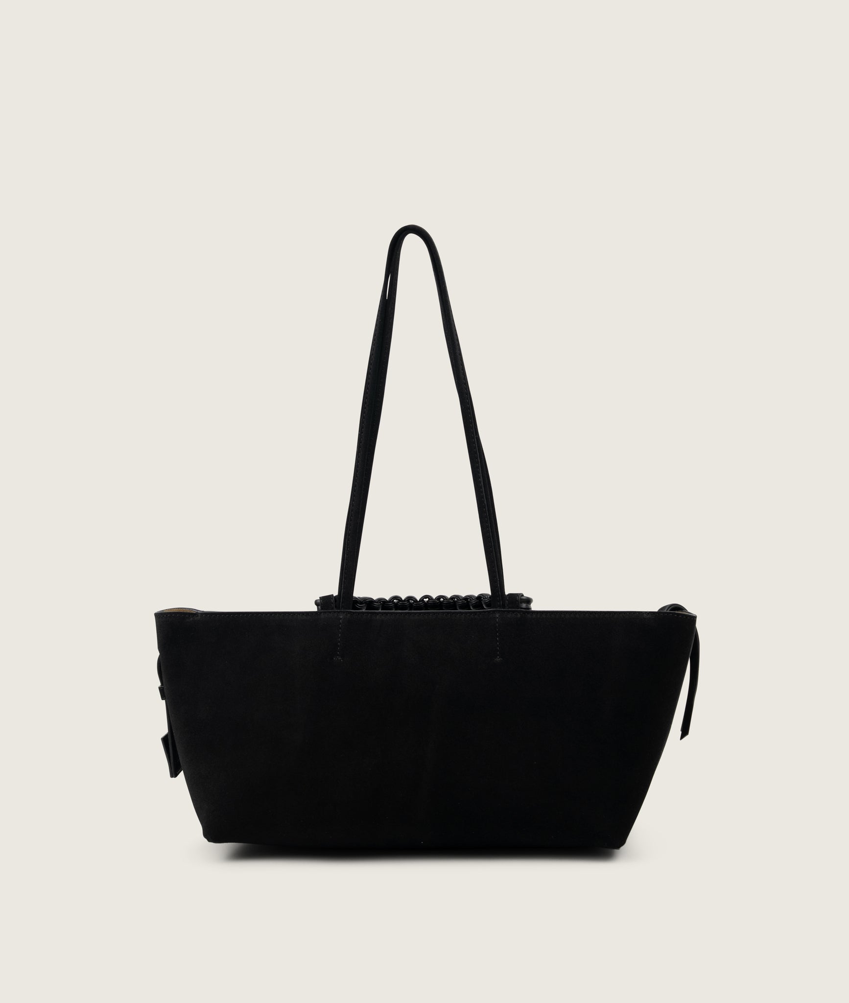 Pazar I Pazar Tote Boat I suede black I showing iconic SAGAN closing system I back view I white background