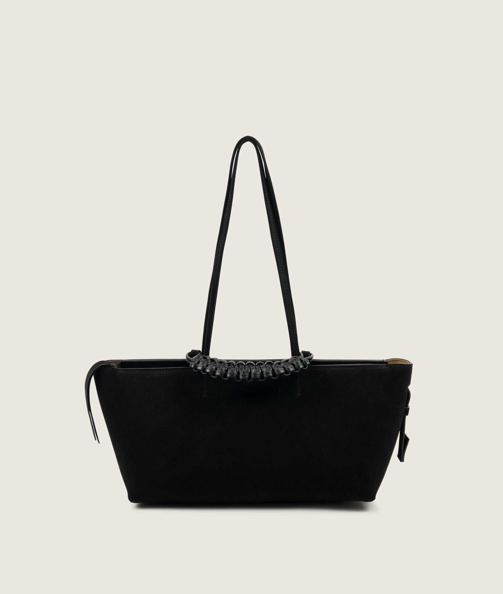 Pazar I Pazar Tote Boat I suede black I showing iconic SAGAN closing system I front view I white background