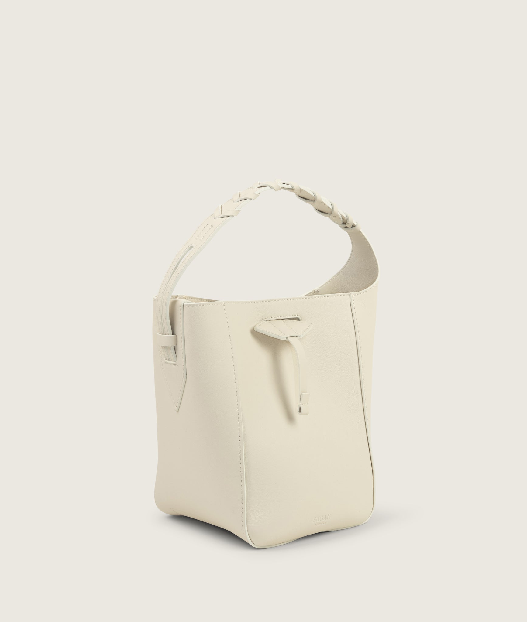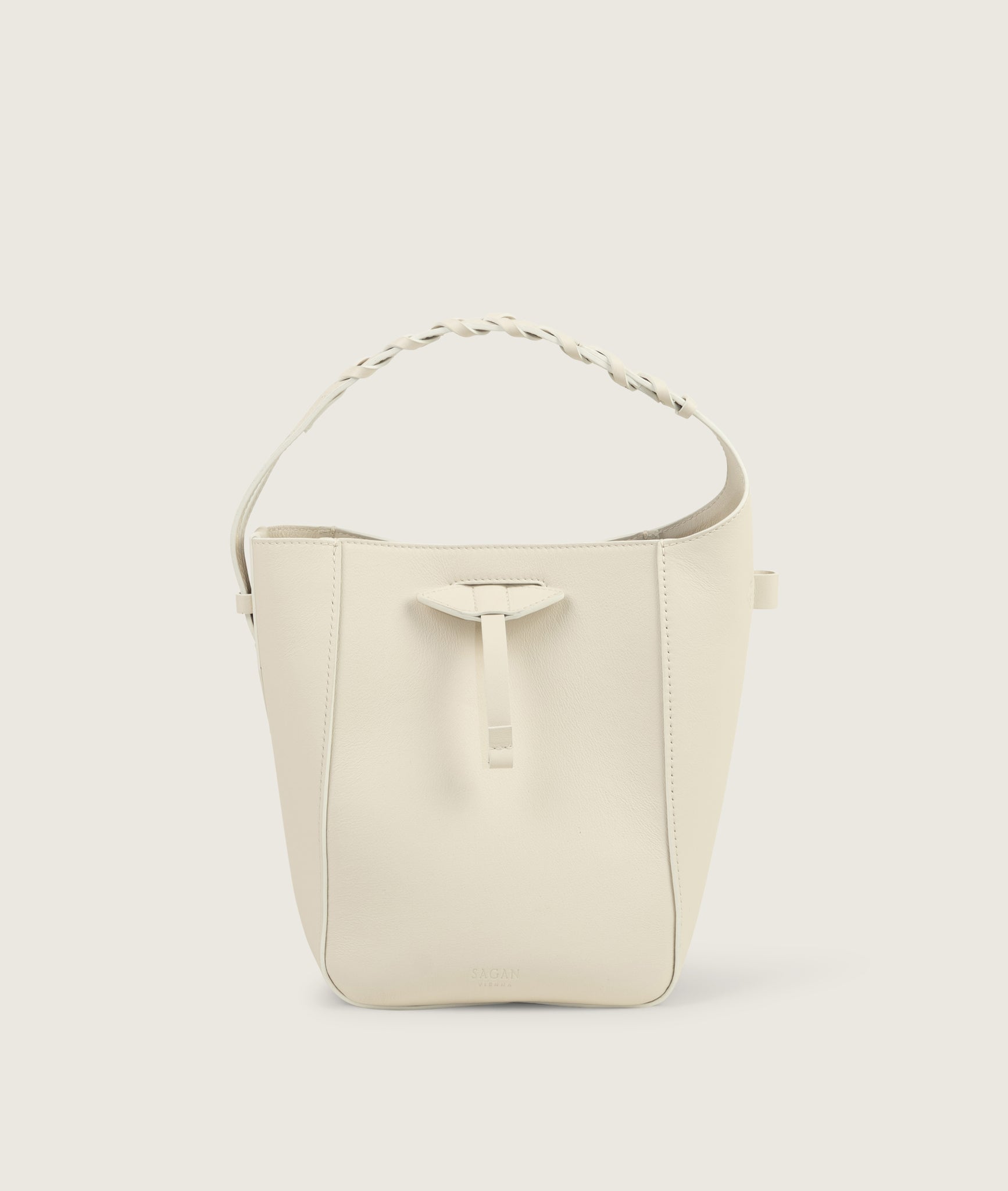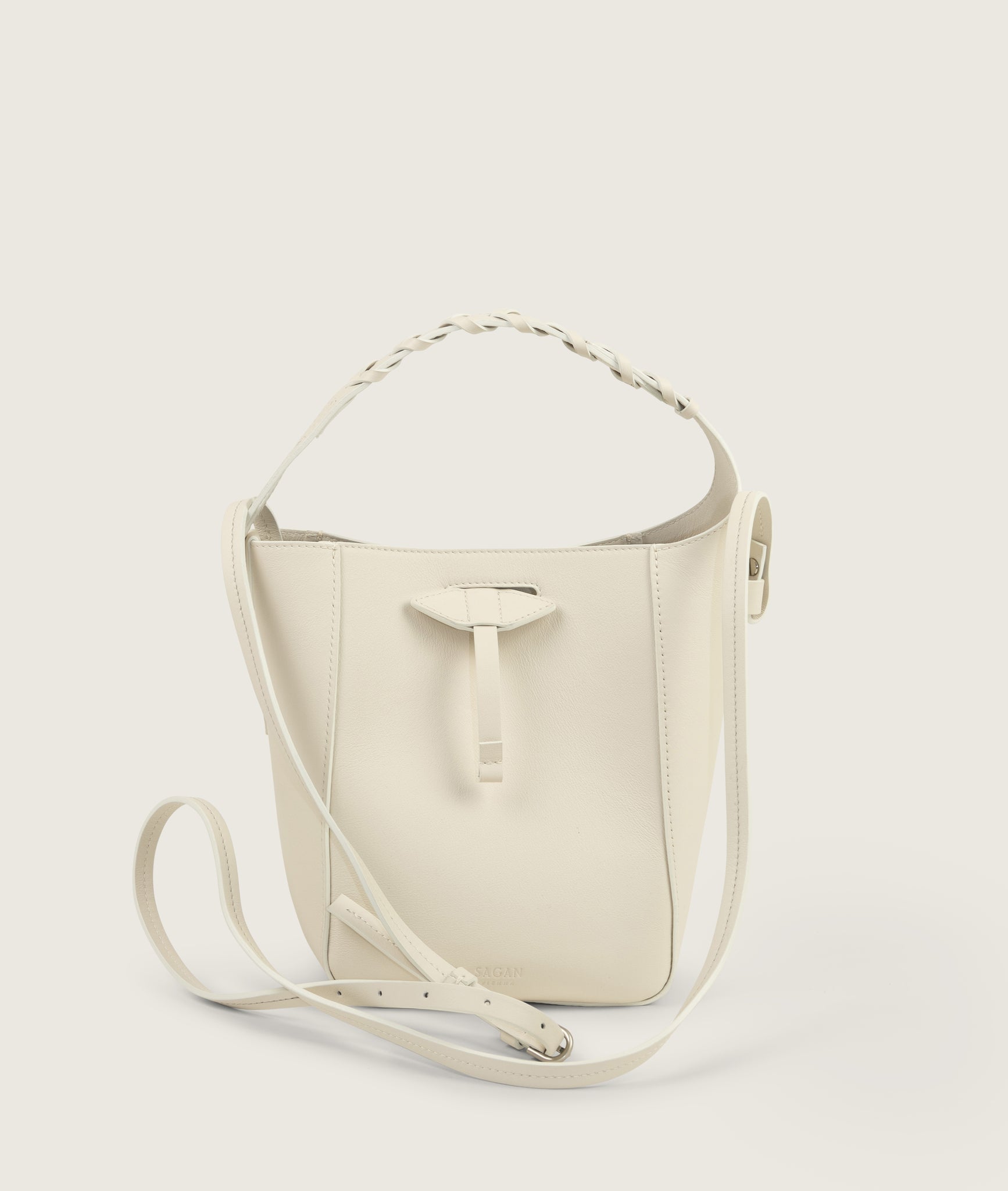 Bucket bag from soft Italian cow leather. This small bag surprises with a roomy interior, allows you to carry all your essential belongings with you. Clean design gets a twist with the hand braided handle inspired by the horse reins. Can be worn cross-body or over the shoulder do to the thin long adjustable sholder strap and around the wrist using short handle.