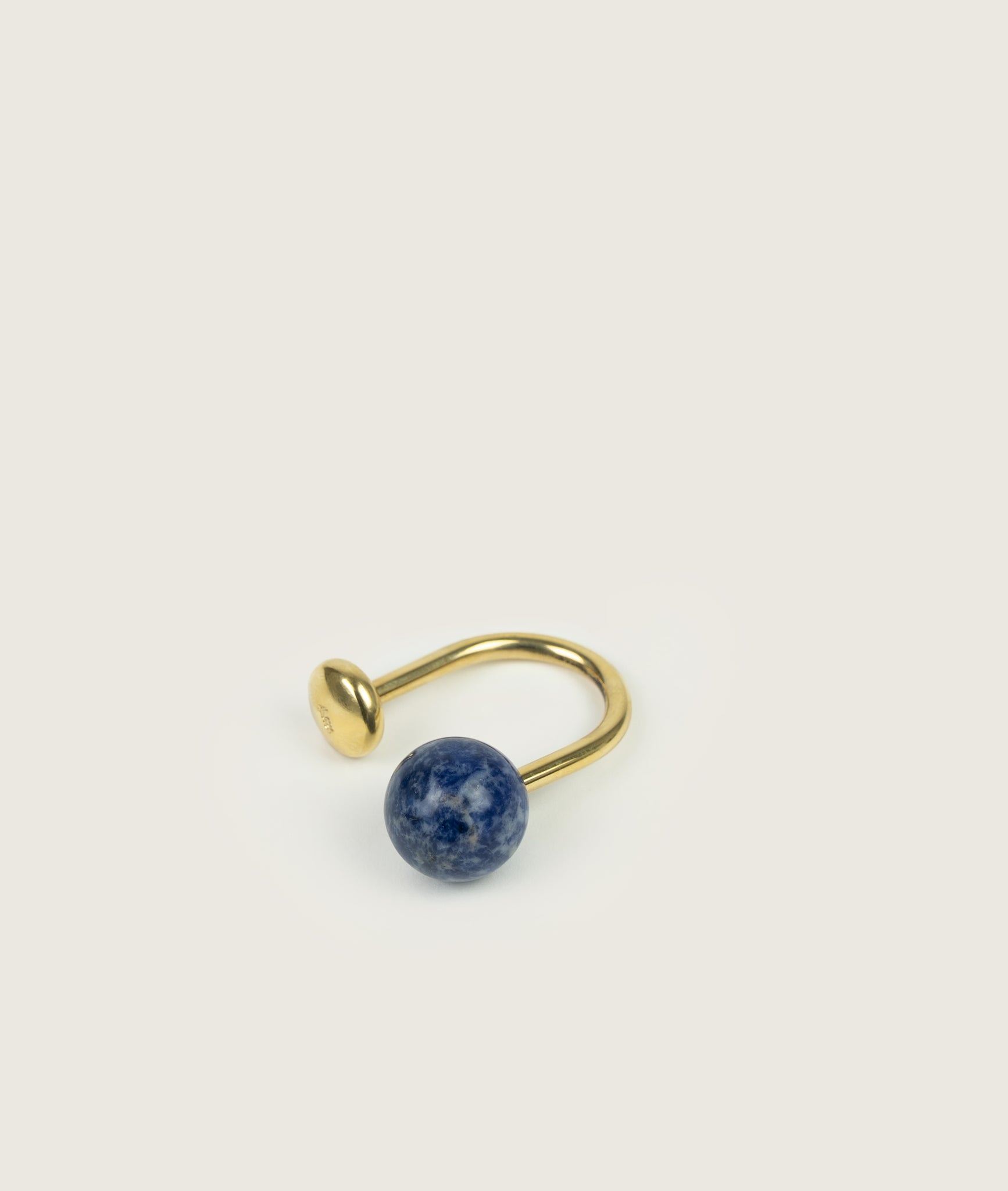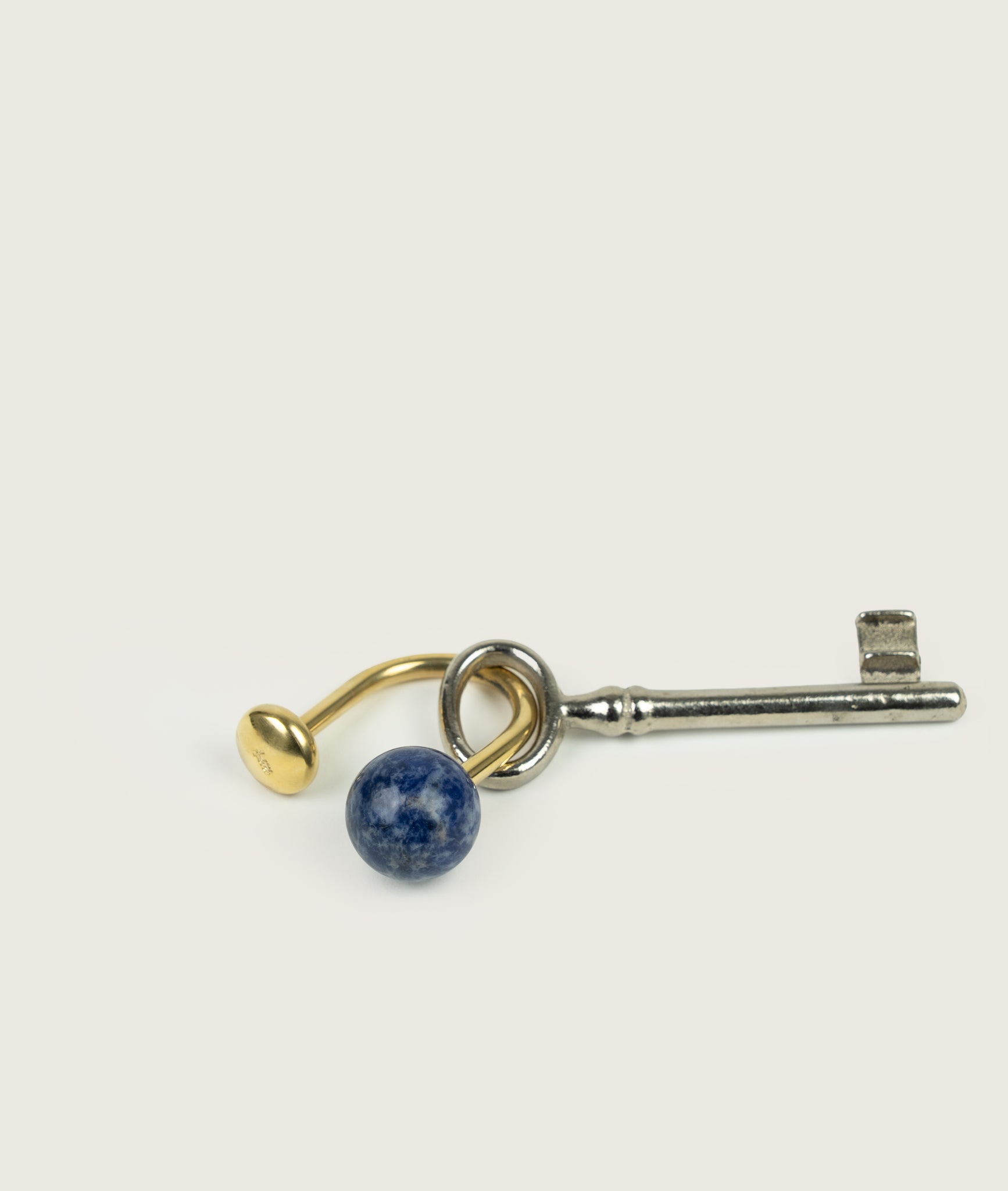 The brass stopper opens for securing keys, while the stone sphere is fixed in place for durability.